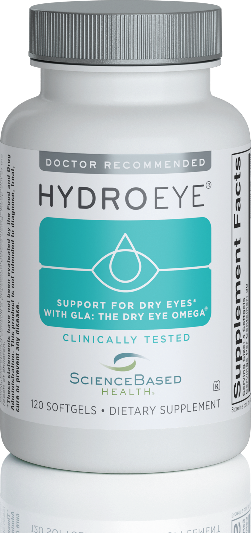 HydroEye is a patented nutritional formulation that works from the inside out to provide continuous support for dry, itchy eyes. HydroEye, clinically found to promote dry eye comfort in peer reviewed research, delivers a proprietary blend of GLA: the dry eye omega, plus omega 3 fatty acids (EPA and DHA), plus other key nutrients that work together to support a healthy tear film and soothe the ocular surface.