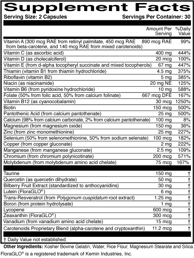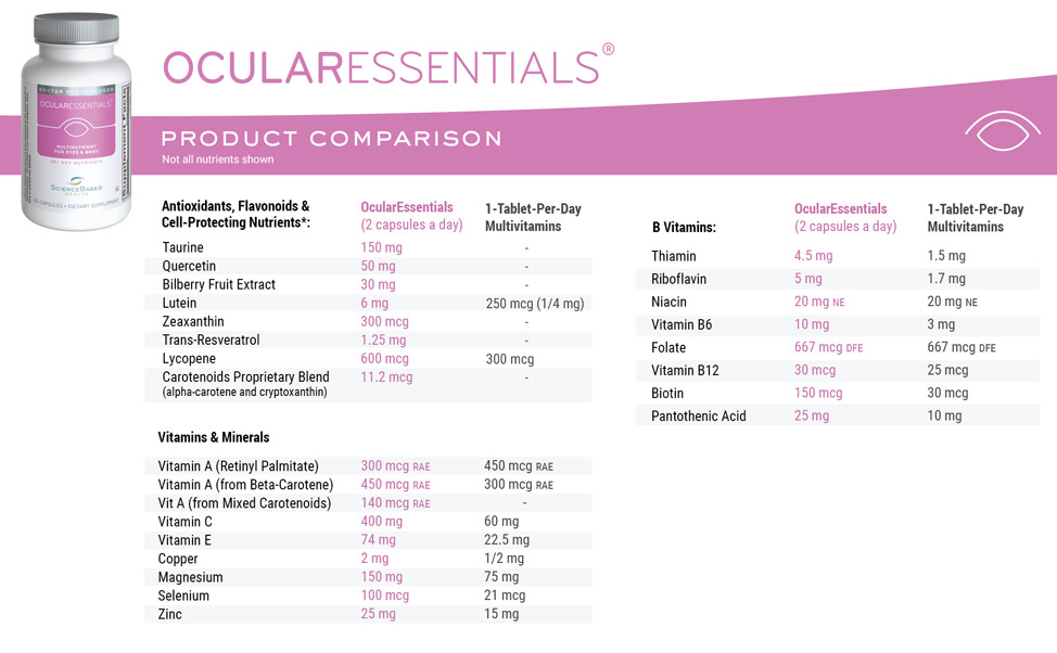 OcularEssentials is a complete multinutrient that protects visual and whole body health. OcularEssentials delivers abundant levels of over 30 key nutrients, including natural plant compounds, that help to fight free radicals and promote overall well-being.